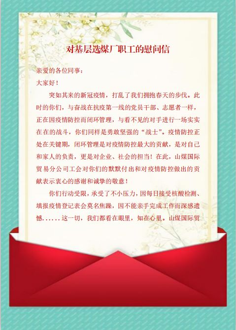為進一步發(fā)揮工會組織群眾優(yōu)勢,助力疫情防控工作,山煤國際貿(mào)易分公司工會對基層選煤廠員工開展了關心關愛以及送溫暖等慰問活動,千方百計幫助員工解決“急難愁盼”問題,將企業(yè)的關懷和工會組織的溫暖送到每一位員工心坎上。