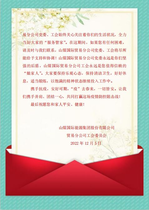 12月4日,山煤國際貿(mào)易分公司工會成立了“一包一保”聯(lián)絡工作組,制定了“一包一保”工作方案,及時對基層選煤廠員工開展了“一對一”的政策宣傳、關心關愛以及送溫暖活動,保障員工吃得熱乎、穿得暖和、睡得安穩(wěn)。12月5日,向基層選煤廠員工送上了慰問信,倡議大家保持清潔衛(wèi)生,好好休息,適當鍛煉,山煤國際貿(mào)易分公司黨委、工會始終關心關注著大家的生活狀況,全力當好“服務管家”。同時安排“一包一保”聯(lián)絡組專人對因疫情防控閉環(huán)管理的員工開展“一對一”電話慰問,詳細了解員工當前的情緒、困難以及生活需求,同步掌握員工家庭生活狀況,及時把組織的溫暖和關懷送到員工的心坎上,切實做好員工信賴的“娘家人”。