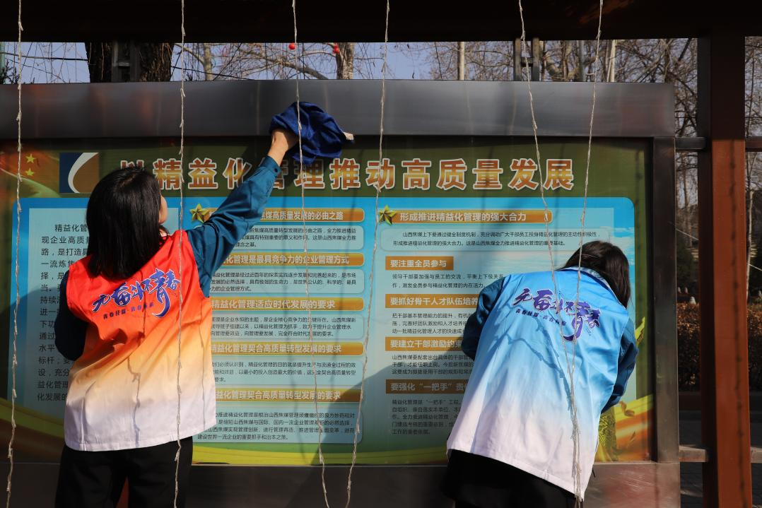活動中,青年志愿者統一著裝,分工合作,相互配合,認真清潔了經坊煤業的所有宣傳欄,把灰塵、污漬一掃而盡,并對宣傳欄櫥窗玻璃進行了擦拭。經過大家一個多小時的努力,公司宣傳欄光亮如新。