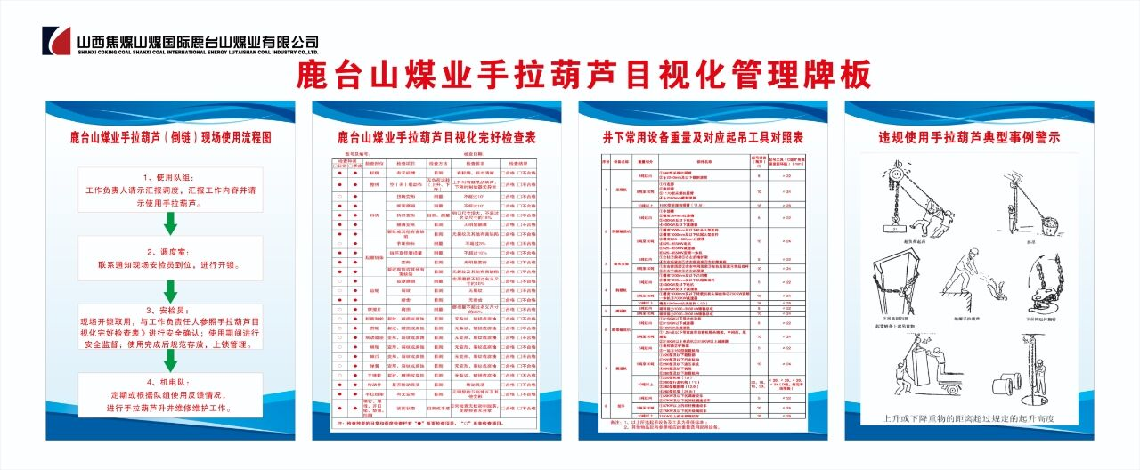 為了提高手拉葫蘆現(xiàn)場使用人員對使用流程、完好標(biāo)準(zhǔn)、吊具選用規(guī)格要求及常見違規(guī)案例現(xiàn)象的了解和掌握,鹿臺山煤業(yè)采用圖示的方式將手拉葫蘆使用流程圖、注意事項(xiàng)、錯(cuò)誤案例示范等內(nèi)容懸掛在醒目位置,實(shí)行了現(xiàn)場目視化看板管理,為現(xiàn)場使用人員提供了可靠的流程指導(dǎo)、使用規(guī)范、完好標(biāo)準(zhǔn)和工具選用參考引導(dǎo),進(jìn)一步規(guī)范了使用操作行為,提高了標(biāo)準(zhǔn)化流程化作業(yè)水平。