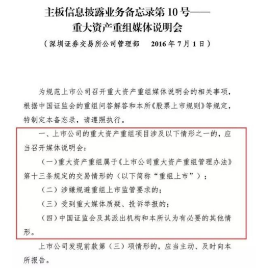自深交所7月1日發(fā)布《重大資產(chǎn)重組媒體說(shuō)明會(huì)備忘錄》后,“媒體說(shuō)明會(huì)”首次成為上市公司重大資產(chǎn)重組復(fù)牌前的“規(guī)定動(dòng)作”。
