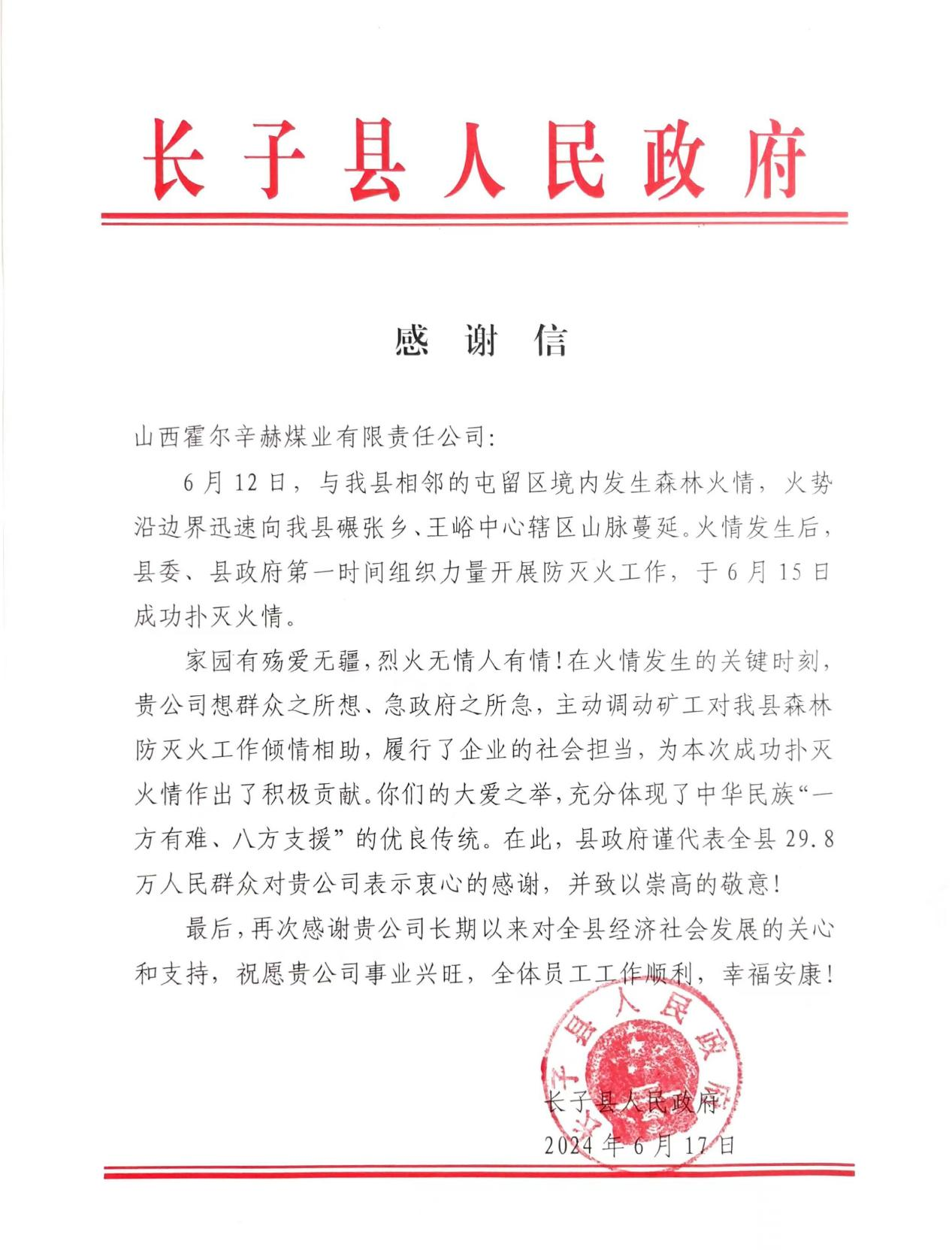 長子縣政府特地向霍爾辛赫煤業發來感謝信,代表全縣人民群眾對該公司為撲滅火情作出的貢獻表示衷心感謝。霍爾辛赫煤業表示,在今后的工作中將繼續秉承這份擔當與責任,以堅定的信念和無畏的勇氣,為當地安全高質量發展貢獻力量。